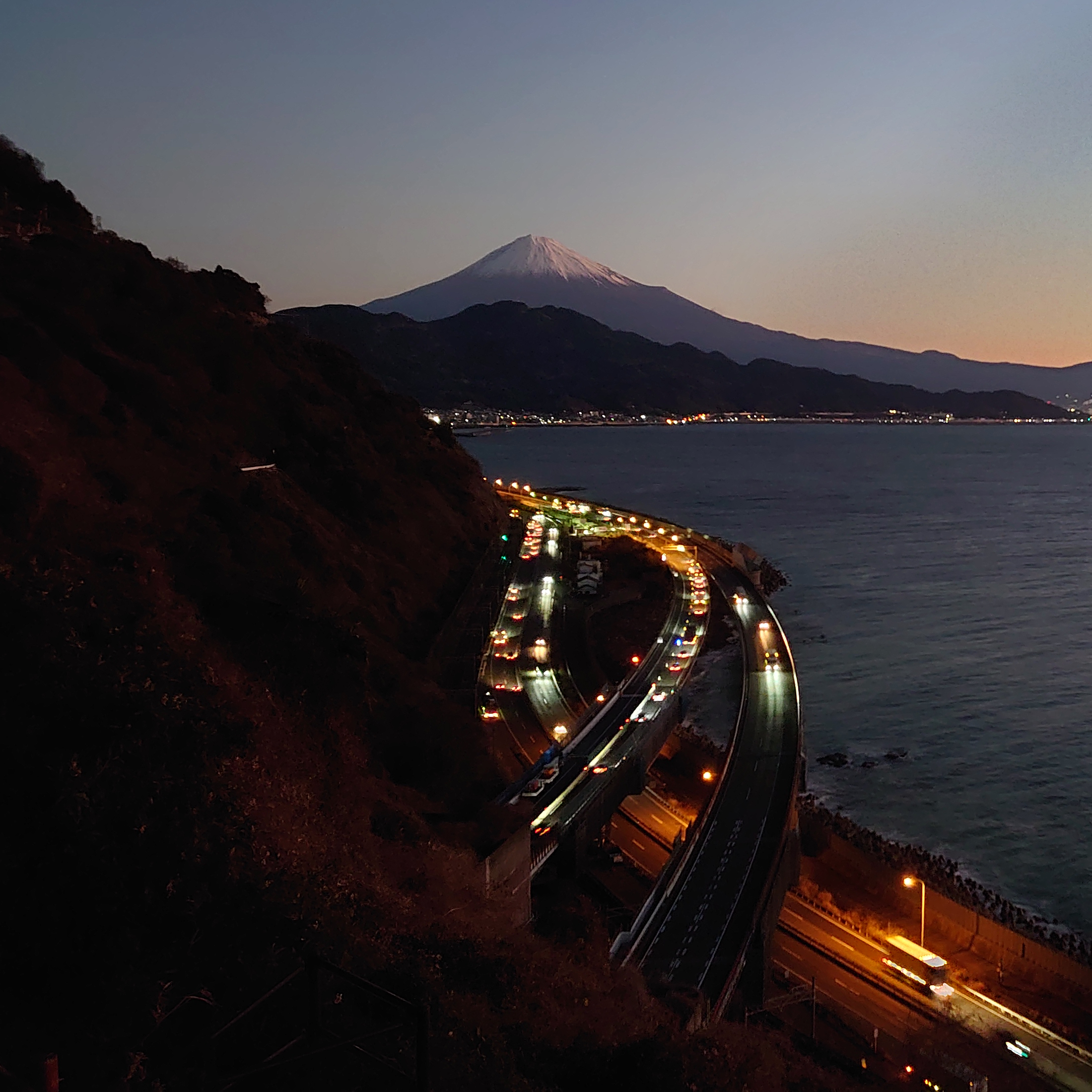 旧東海道の由比宿と興津宿を結ぶ峠道から、駿河湾、富士山、国道1号線、東名高速、JR東海道線の景色を一緒に楽しめる展望の名所ともいえる絶景スポットです。