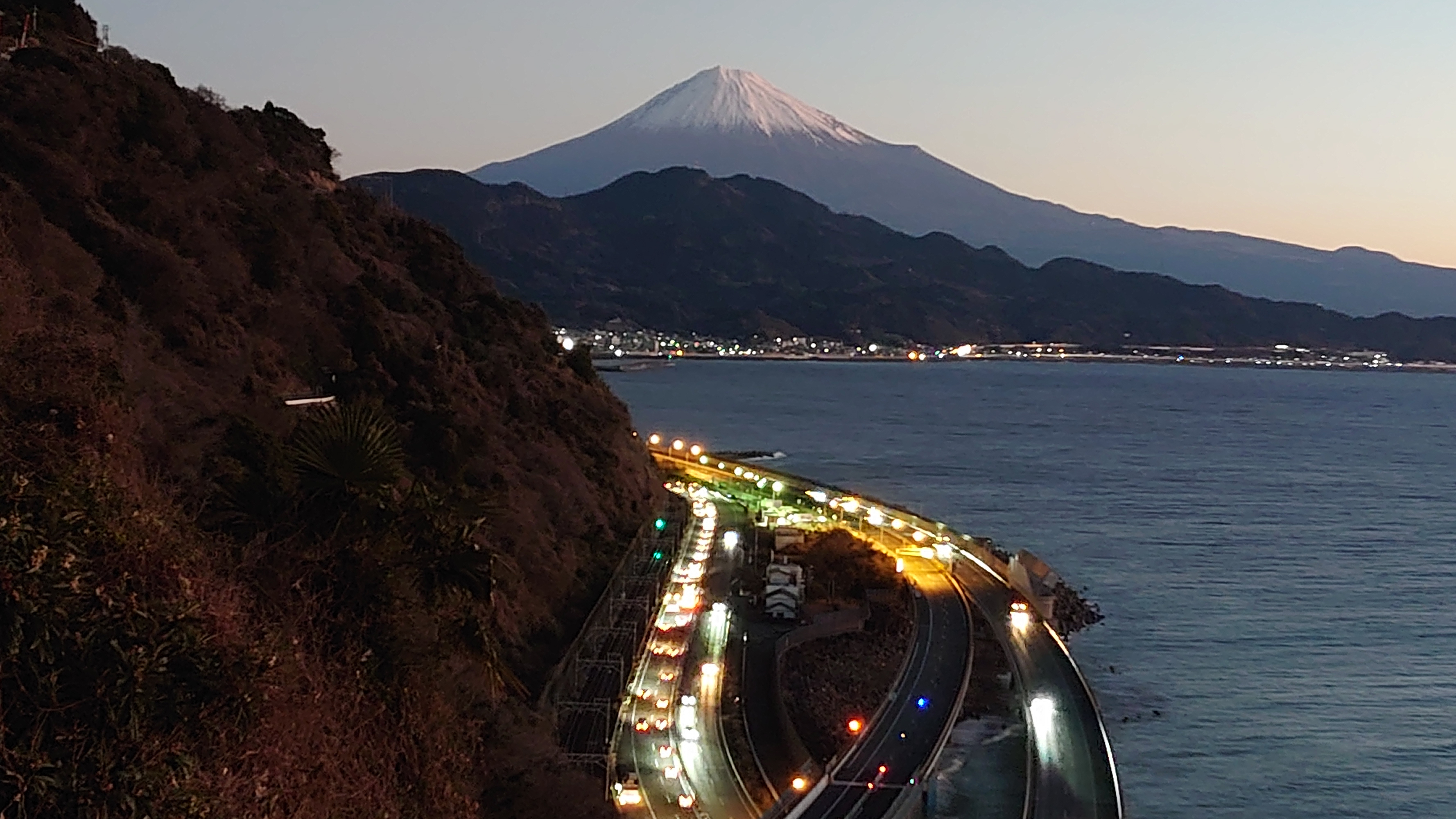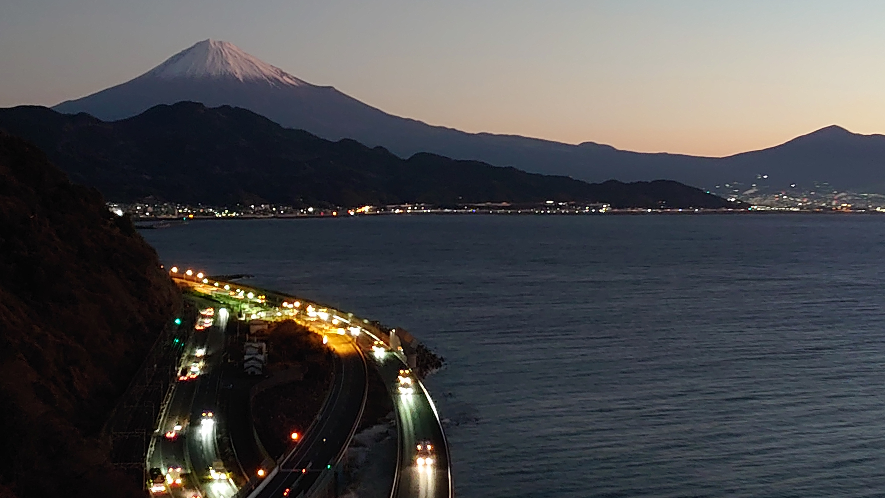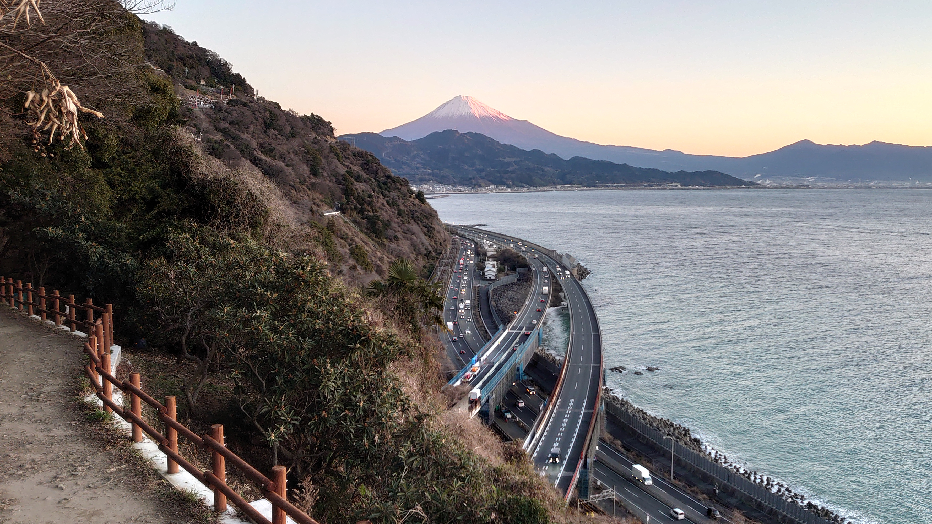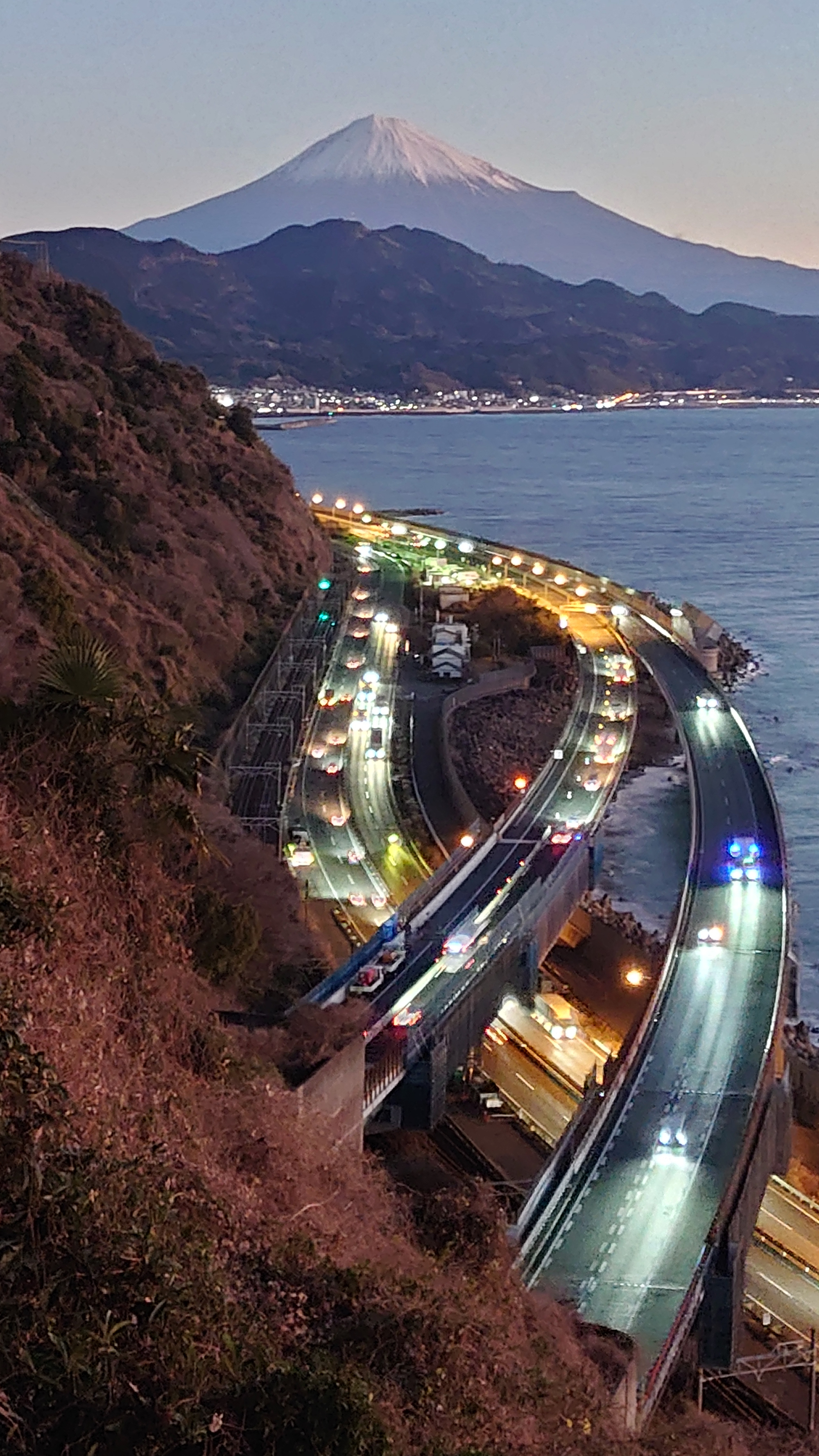 富士山と東名高速を眺められる名所として有名な絶景スポットです。色々なパンフレットなどにも使われる風景です。また、歌川広重の浮世絵「由比町・広重浮世絵」にも描かれた風情ある夜景スポットです。外灯はありませんので、駐車場からの一本道を懐中電灯片手に5分程歩くと木製展望デッキがあり、ここがビュースポットになります。
