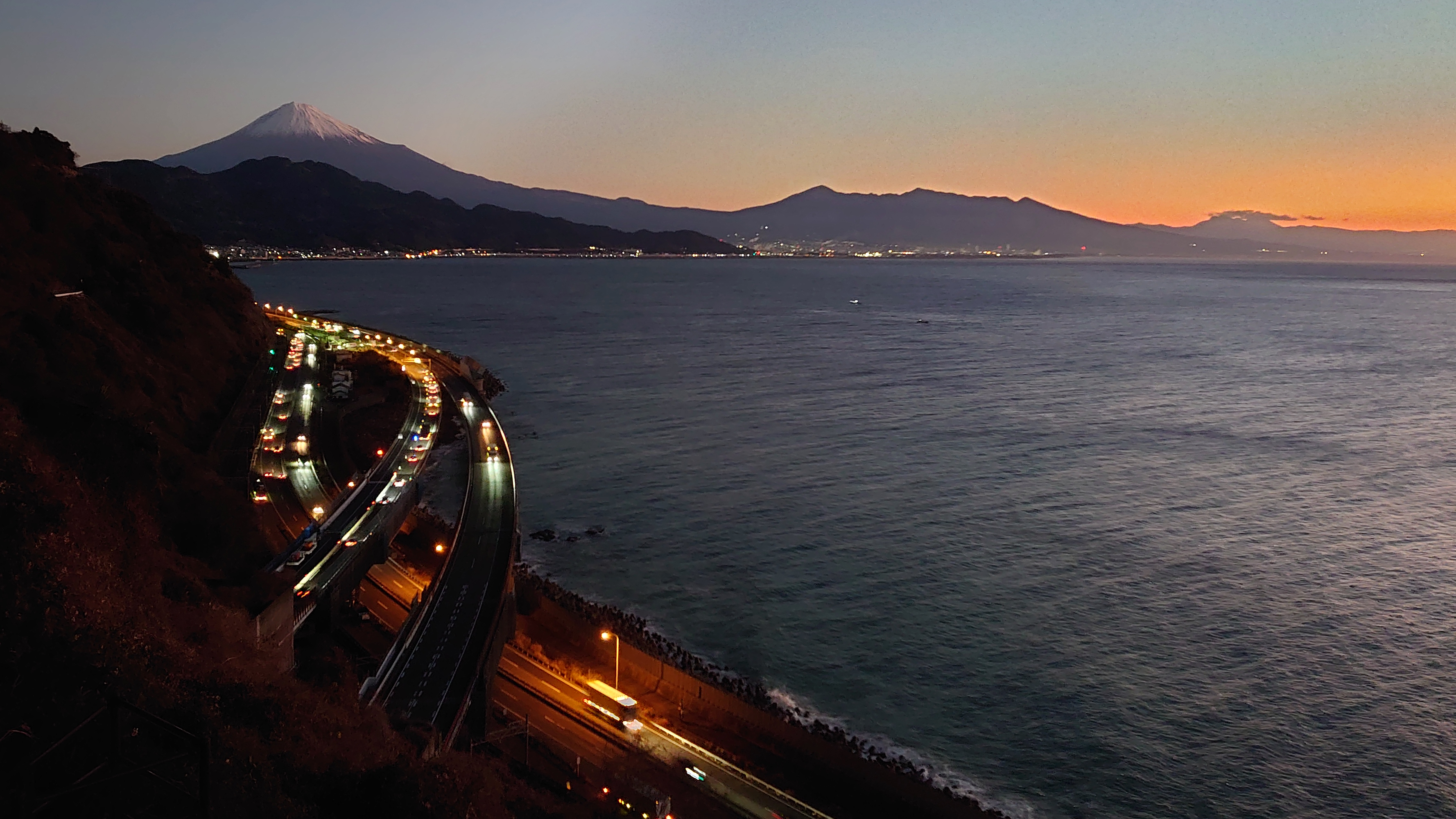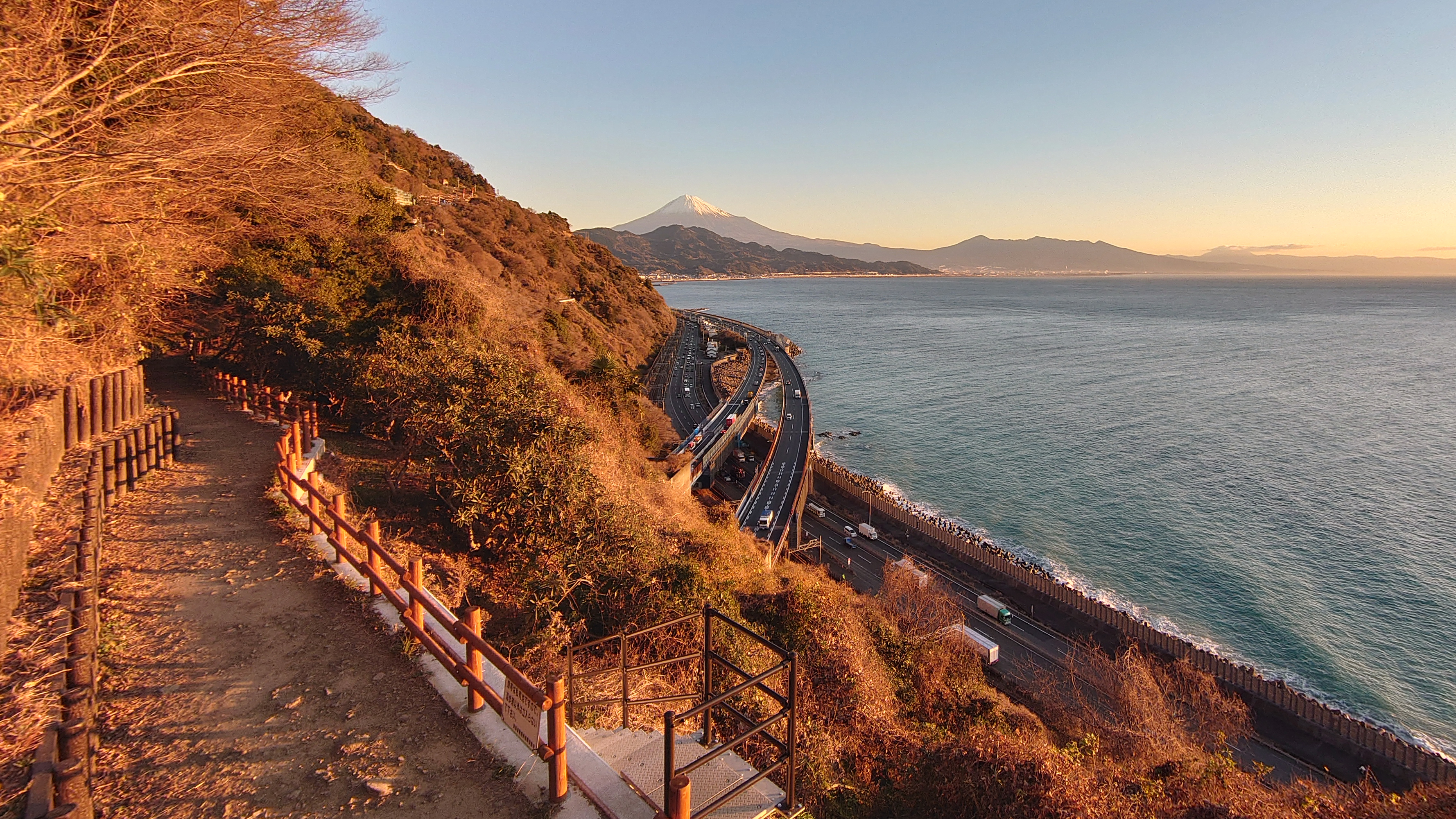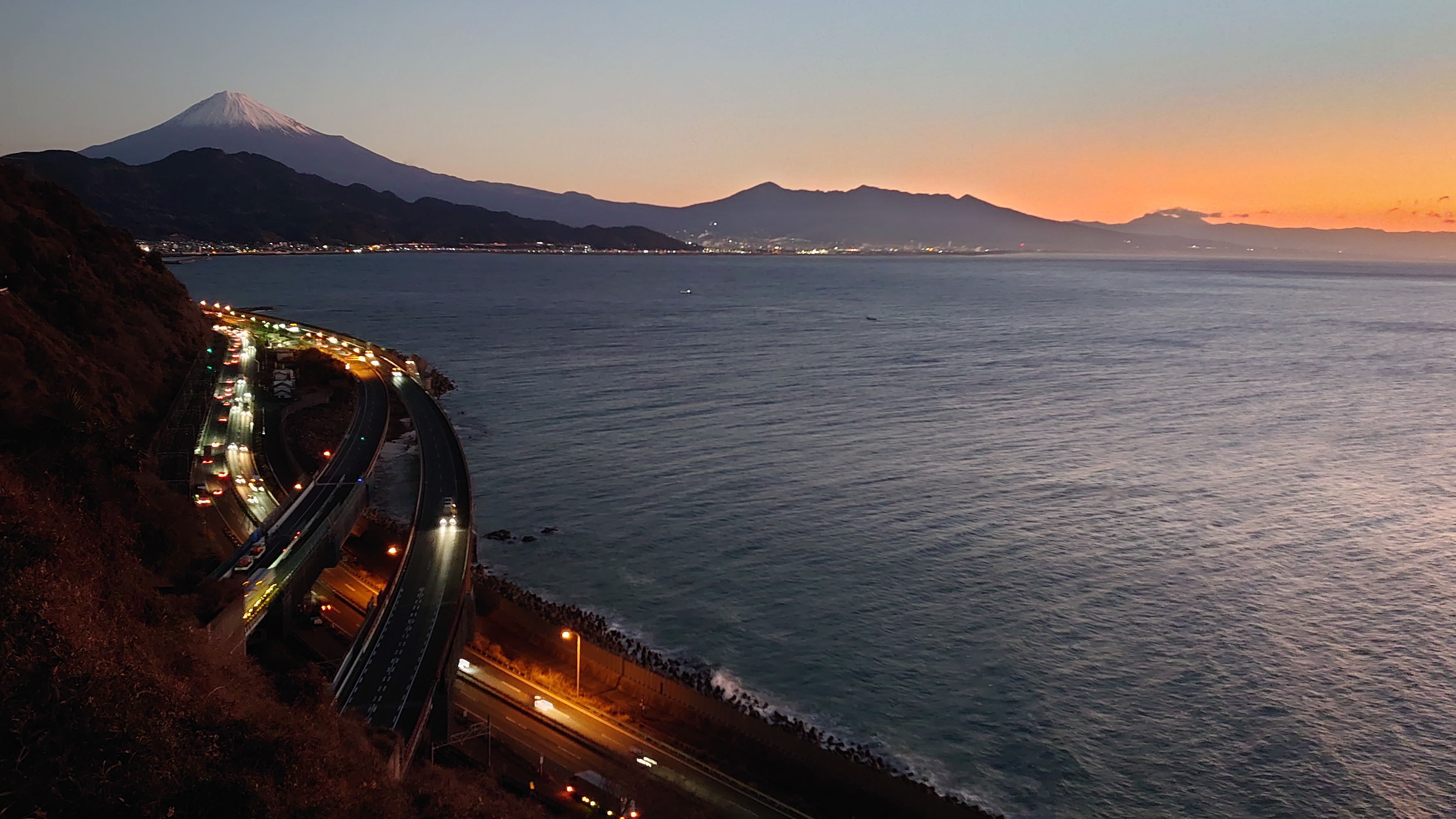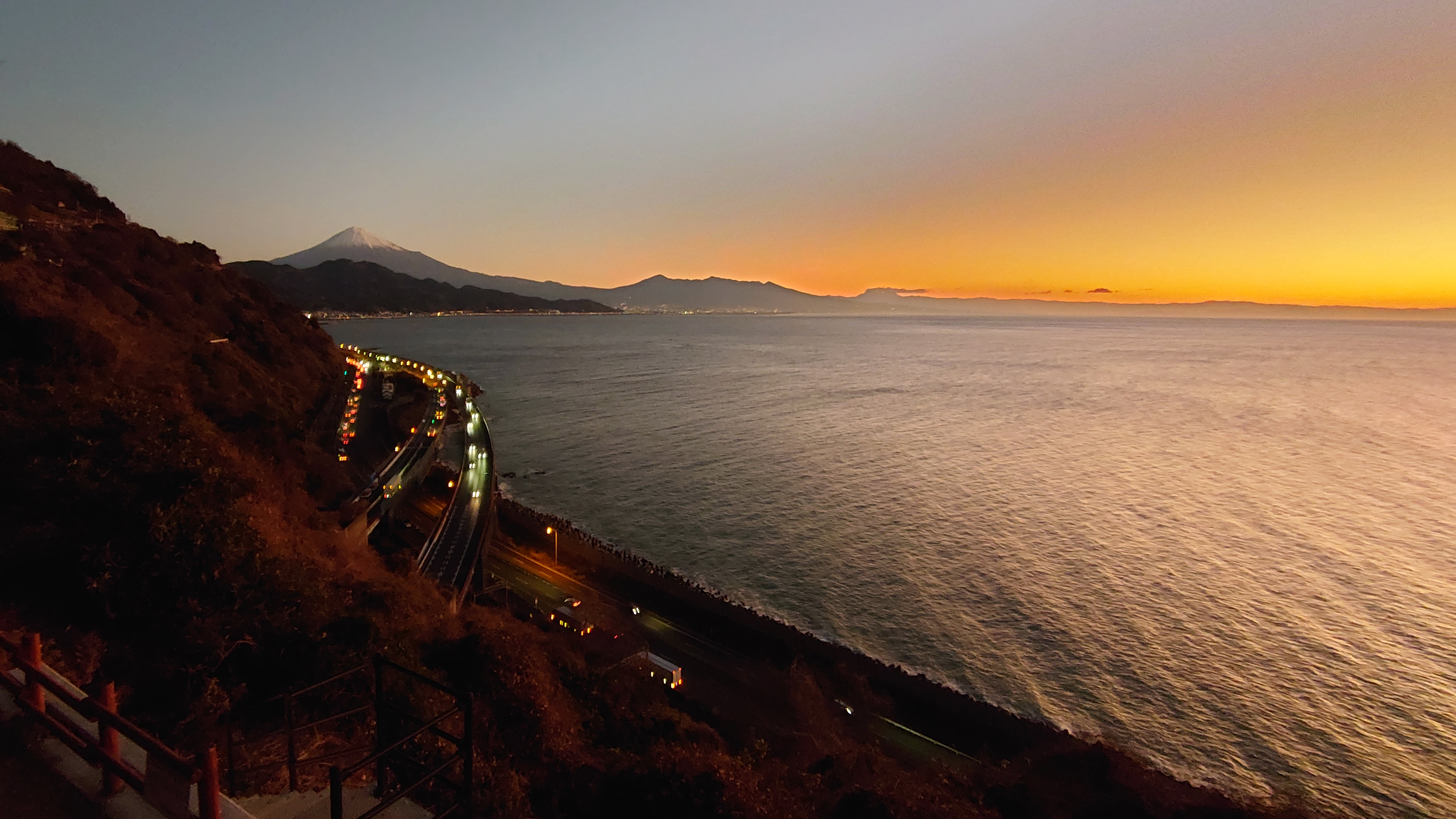 富士山と東名高速を眺められる名所として有名な絶景スポットです。色々なパンフレットなどにも使われる風景です。また、歌川広重の浮世絵「由比町・広重浮世絵」にも描かれた風情ある夜景スポットです。外灯はありませんので、駐車場からの一本道を懐中電灯片手に5分程歩くと木製展望デッキがあり、ここがビュースポットになります。
